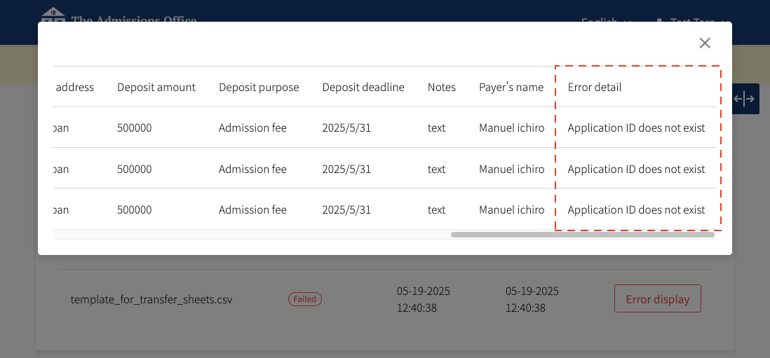 <CSV File Item>Item nameOverviewApplication IDThe Application ID is displayed.Full nameThe applicant’s name is displayed.Examinee numberThe examinee number is displayed.Notification flagYou can set the notification flag.Enter “1” to notify, or “0” to not notify.Bank of the payeeEnter the name of the bank for the deposit.Account numberEnter the account number for the deposit.Account typeEnter the type of account (e.g., savings, checking).Account nameEnter the account holder’s name.Account name (furigana)Enter the phonetic spelling of the account holder’s name (Furigana).University addressEnter the university address.Deposit amountThe deposit amount is displayed.Deposit purposeEnter the purpose of the deposit.Deposit deadlineEnter the payment deadline in the format YYYY-MM-DD (e.g., 2024-04-01).NotesEnter any notes or messages.Payer's nameEnter the payer’s name. - After editing, upload the file and click “Save”.
