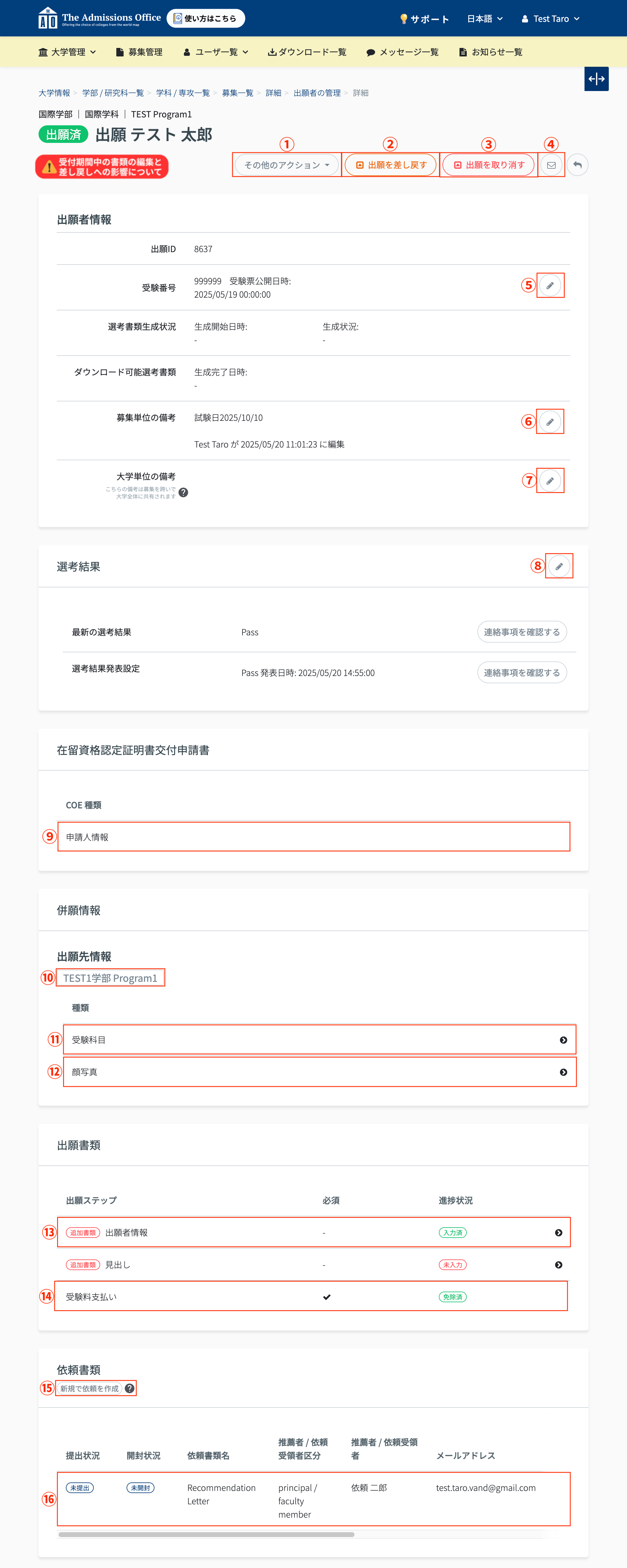 ⑯ 依頼書類の詳細 | 推薦者や依頼受領者が提出した依頼書類を表示します。 クリックすると書類の確認をすることができます。 また、未提出の依頼書類を提出扱いにすることができます。 |