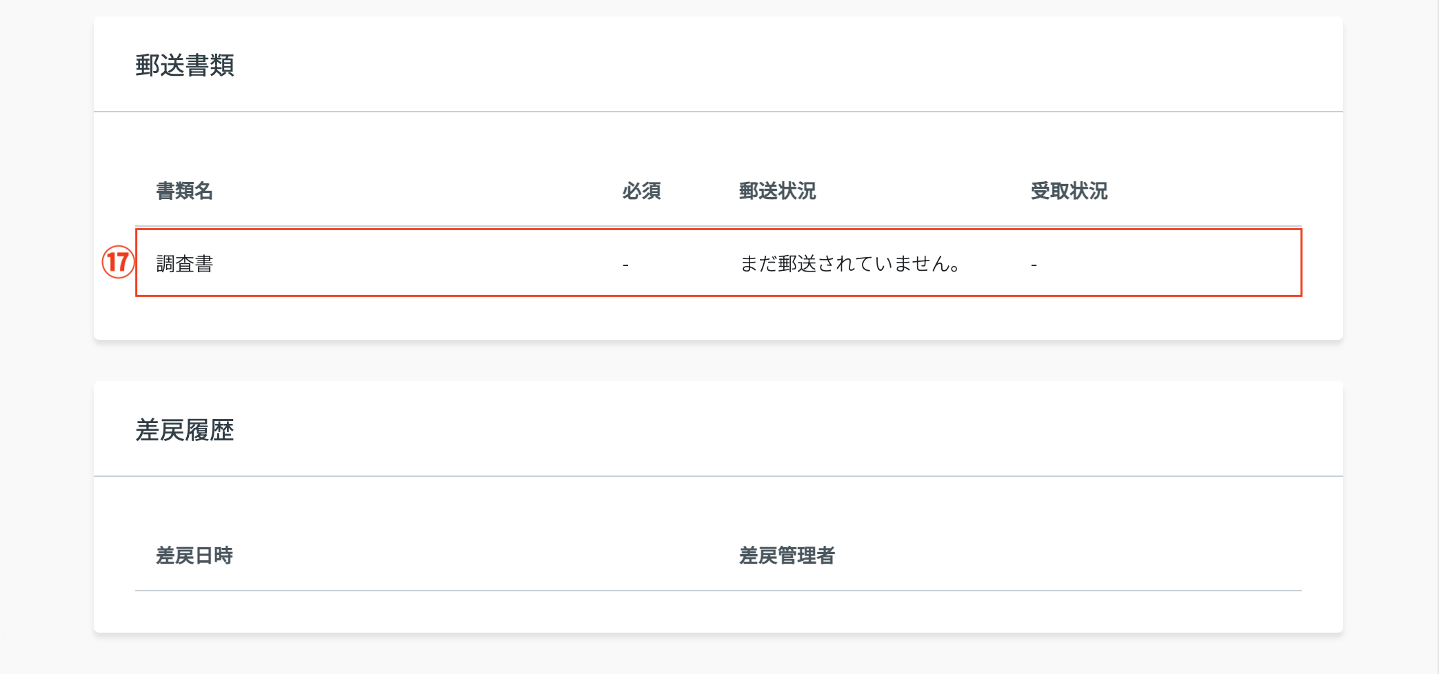 ⑰ 郵送書類の受取 | 郵送書類の受取状況を表示します。 「「受取済」にする」をクリックすると書類が「受取済」になり、出願者アカウントにも受取済の状況が共有されます。 書類をクリックすると書類の確認をすることができます。 |