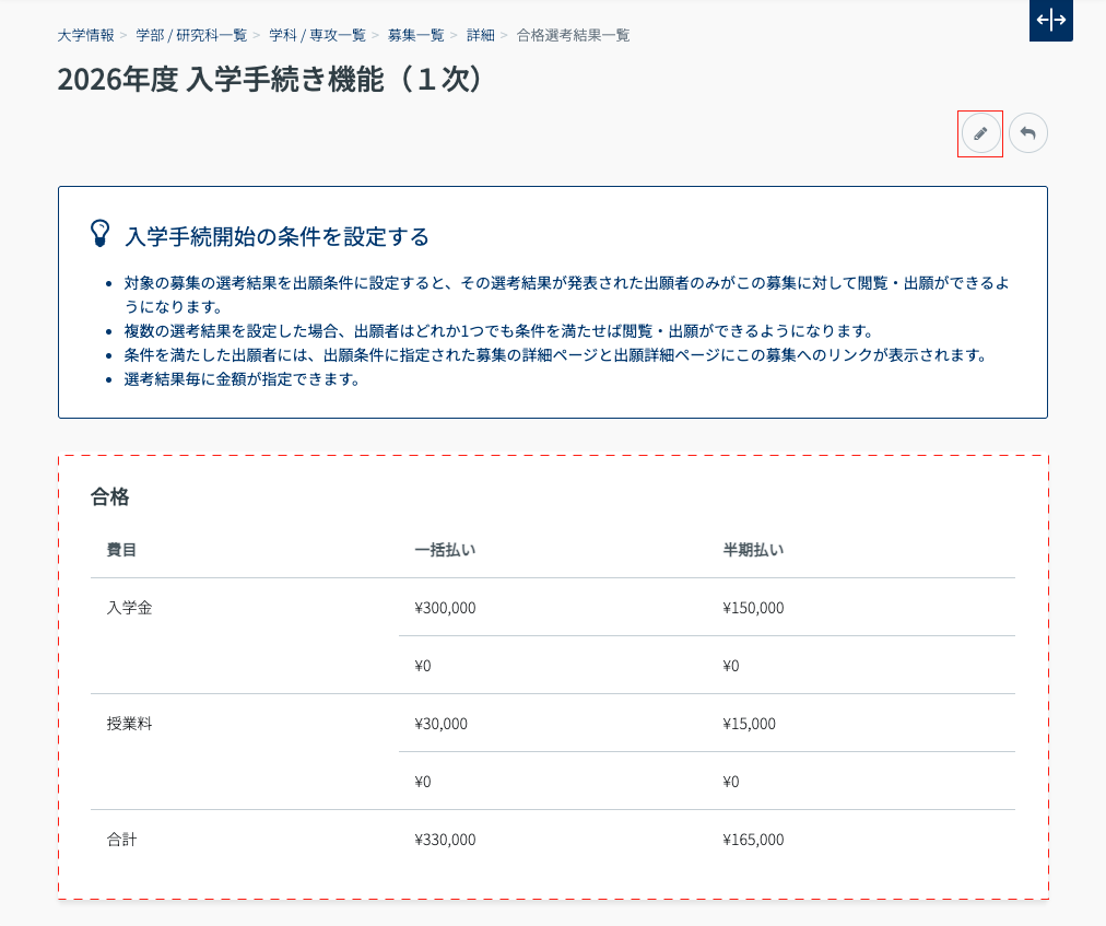 - 設定した金額は、出願者操作により手続開始される前まで反映されます。手続操作開始後は、合格者の管理 > 合格者詳細「支払金額」より、適用させる選考結果による金額を変更します