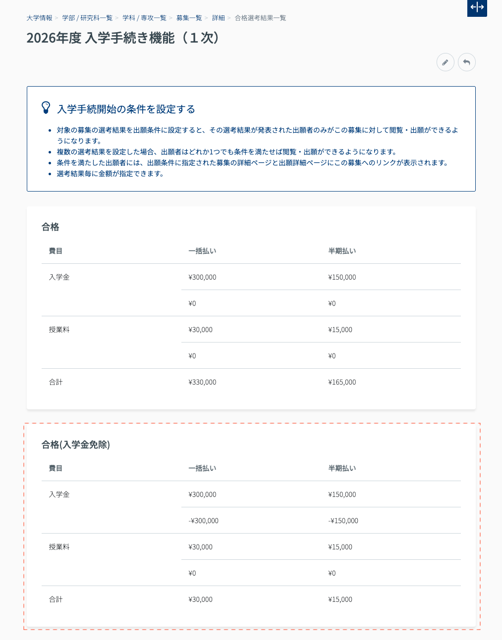 - 入学金・授業料は1つの選考結果に1パターン設定することができます。