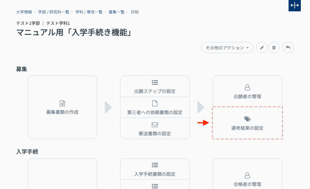 - 入学手続に進むことができるデフォルトの選考結果(合格・手続完了) の他に設定したい場合は、募集の「選考結果の設定」より事前に追加しておく必要があります。その後、追加した選考結果の各金額を設定することで有効な選択肢となります。