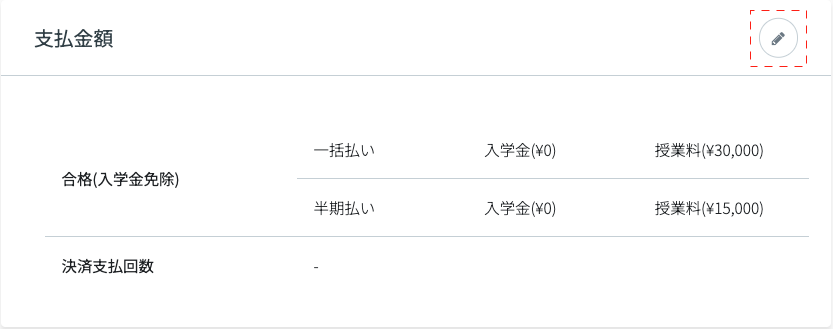 この場合、支払い前であれば、大学管理者画面の 募集詳細 >「合格者の管理」> 詳細 > 支払金額の編集ボタンから、個別に支払金額を変更することができます。