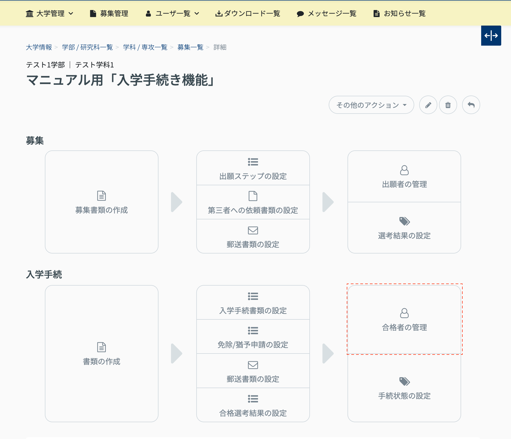 - 募集詳細画面の 合格者の管理 をクリックします。