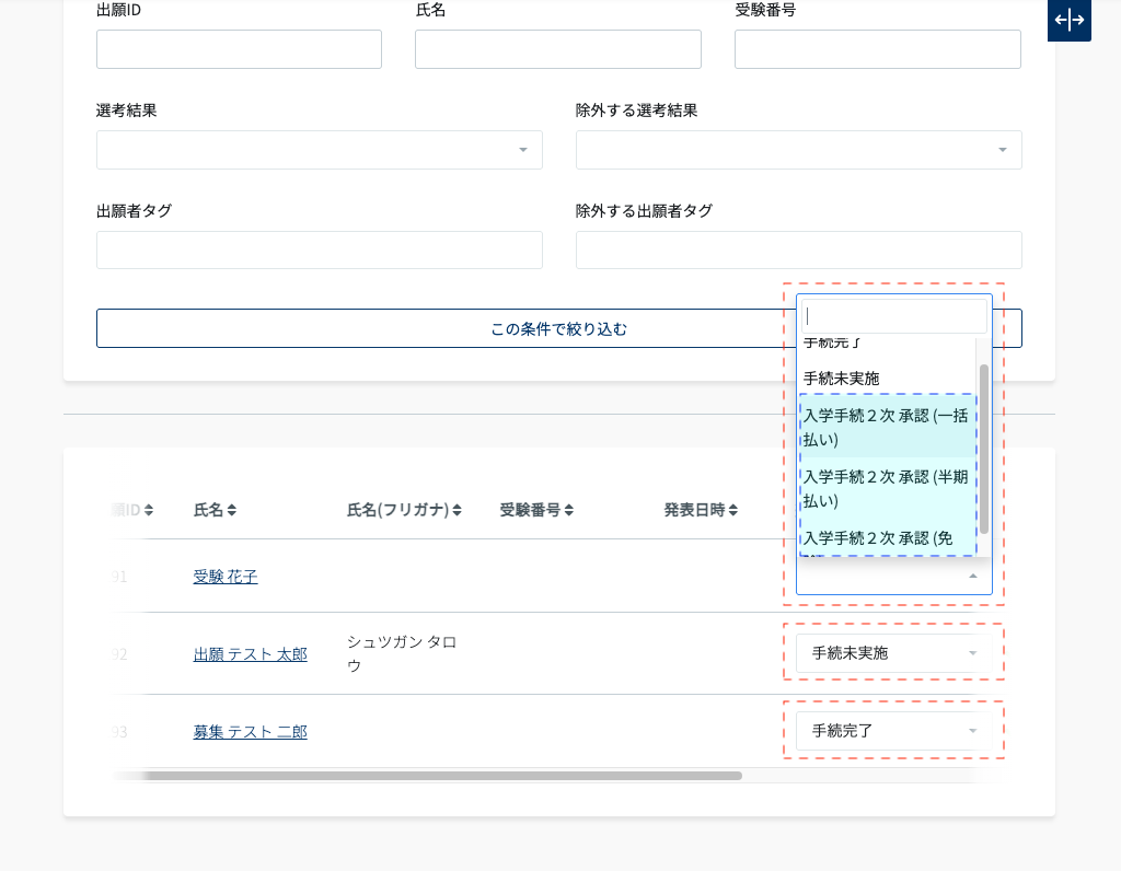 1次入学手続→2次入学手続に進むための選考結果の設定方法については、募集→入学手続 に進むケースと同様に、1次入学手続を完了した合格者に2次入学手続に進むための選考結果を割り当てます。なお、割り当てた選考結果は合格者には通知されません。