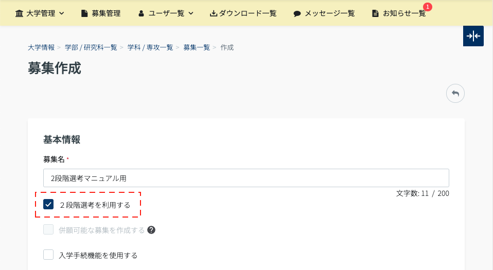 ・募集作成画面で「2段階選考を利用する」チェックボックスを選択します。