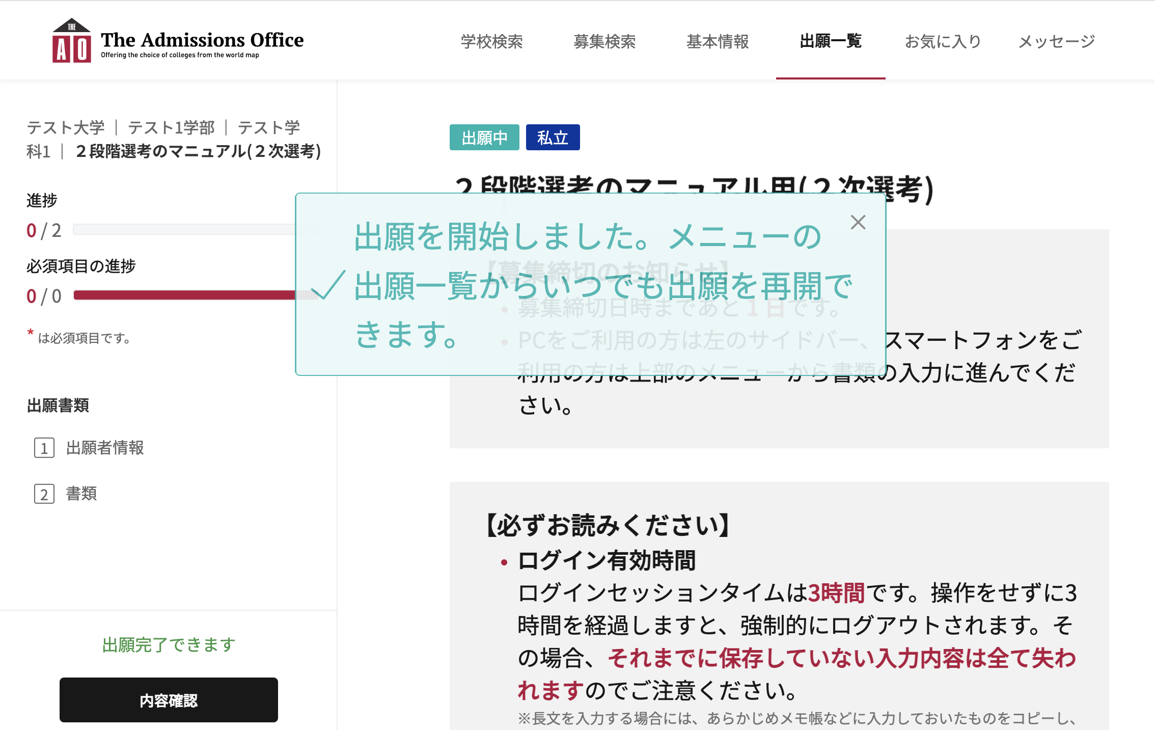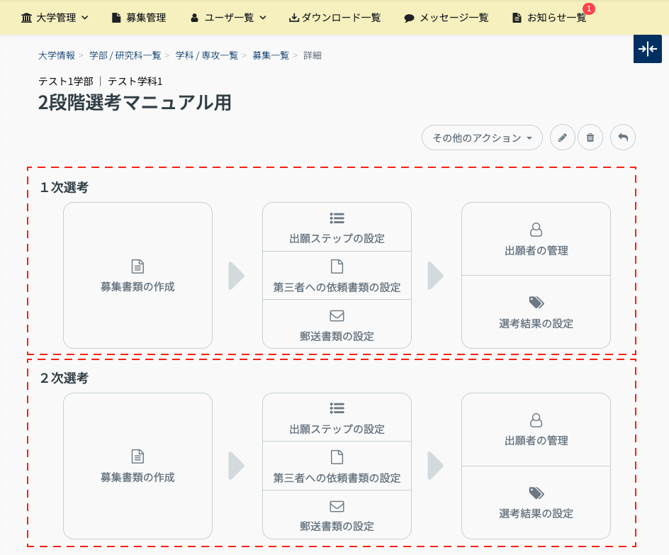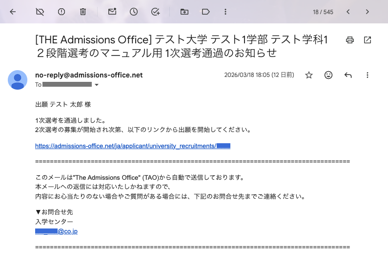 本機能が有効な募集では、すべての出願者はまず ”1次選考” に出願します。その後、大学側にて提出書類の確認および選考結果の設定を行い、大学が設定した選考結果を持つ出願者のみが "2次選考" へと進むことができます。対象者には、出願詳細およびメール・メッセージで2次選考へのリンクが通知されます。