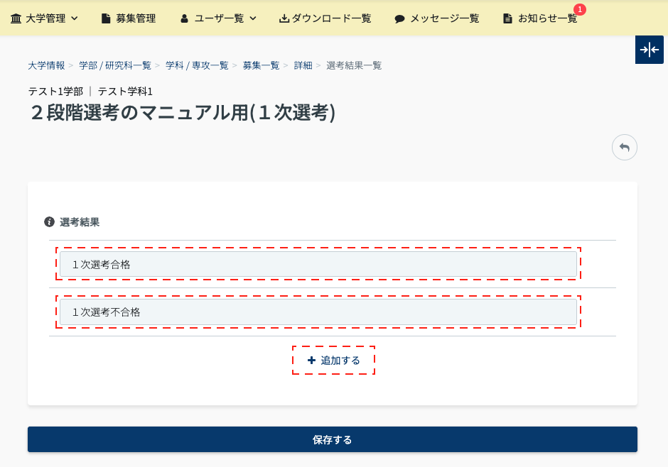 ・2段階選考が有効な募集では、初期値として【1次選考合格】と【1次選考不合格】が設定されています。「追加する」より他の選考結果を追加することができます。