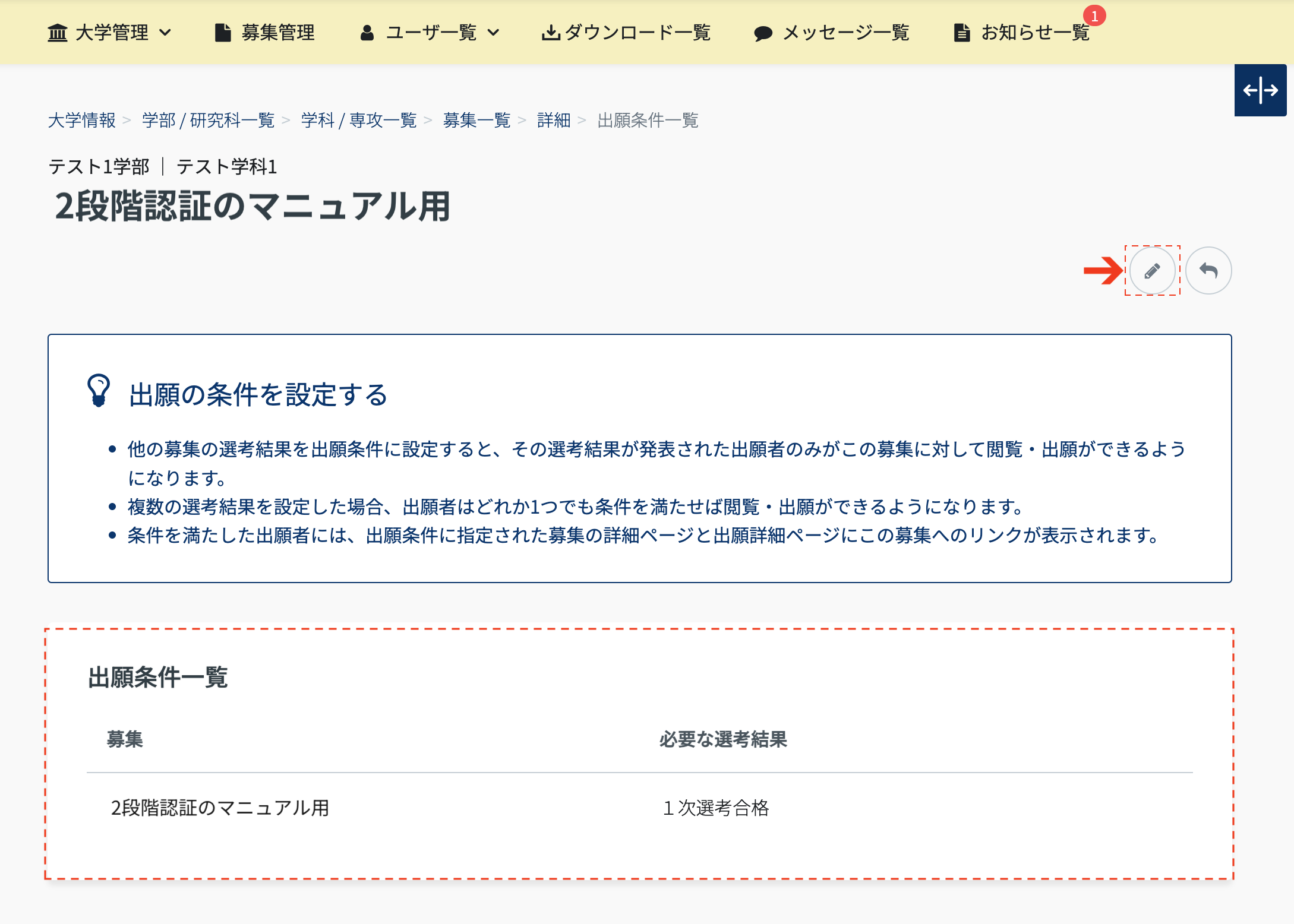 ・2段階選考が有効な募集の、2次選考の出願条件には初期値として【1次選考合格】が設定されています。「編集する」をクリックすると出願条件の編集画面に遷移します。