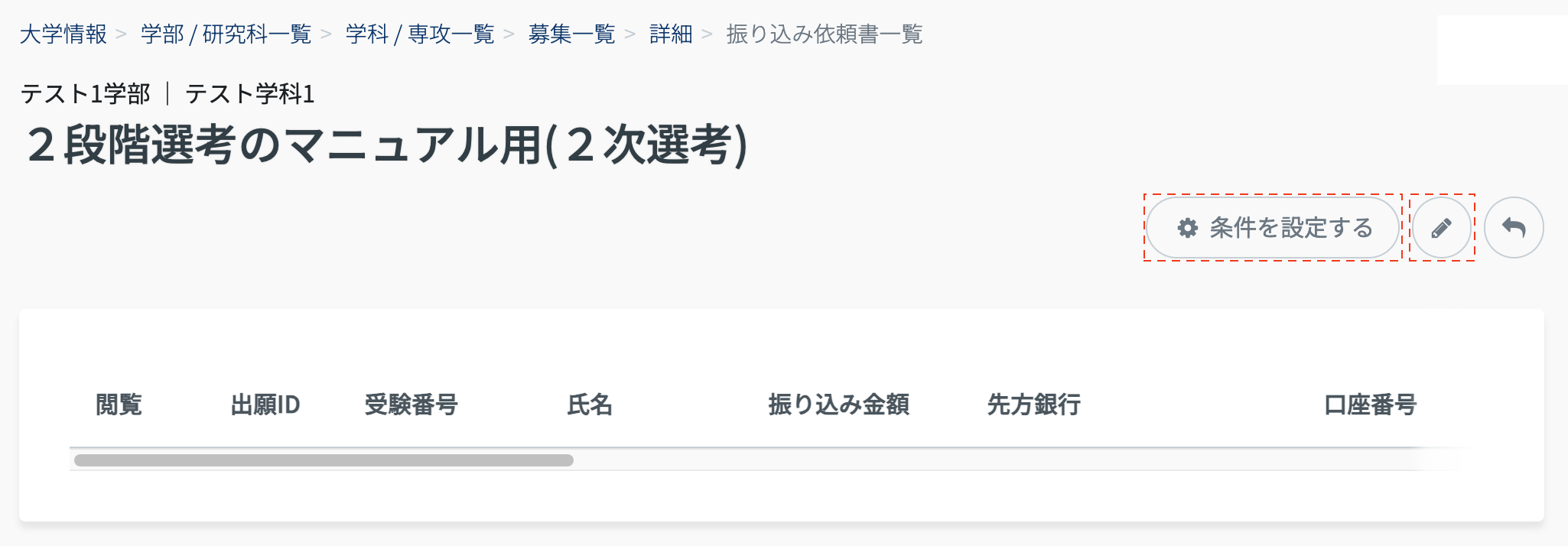 「出願者の管理」>「検索データ一括操作」>「受験票及び受験番号公開日時一括設定」 ![]() | 「出願者の管理」> 詳細 > 受験番号の編集ボタン ![]() |