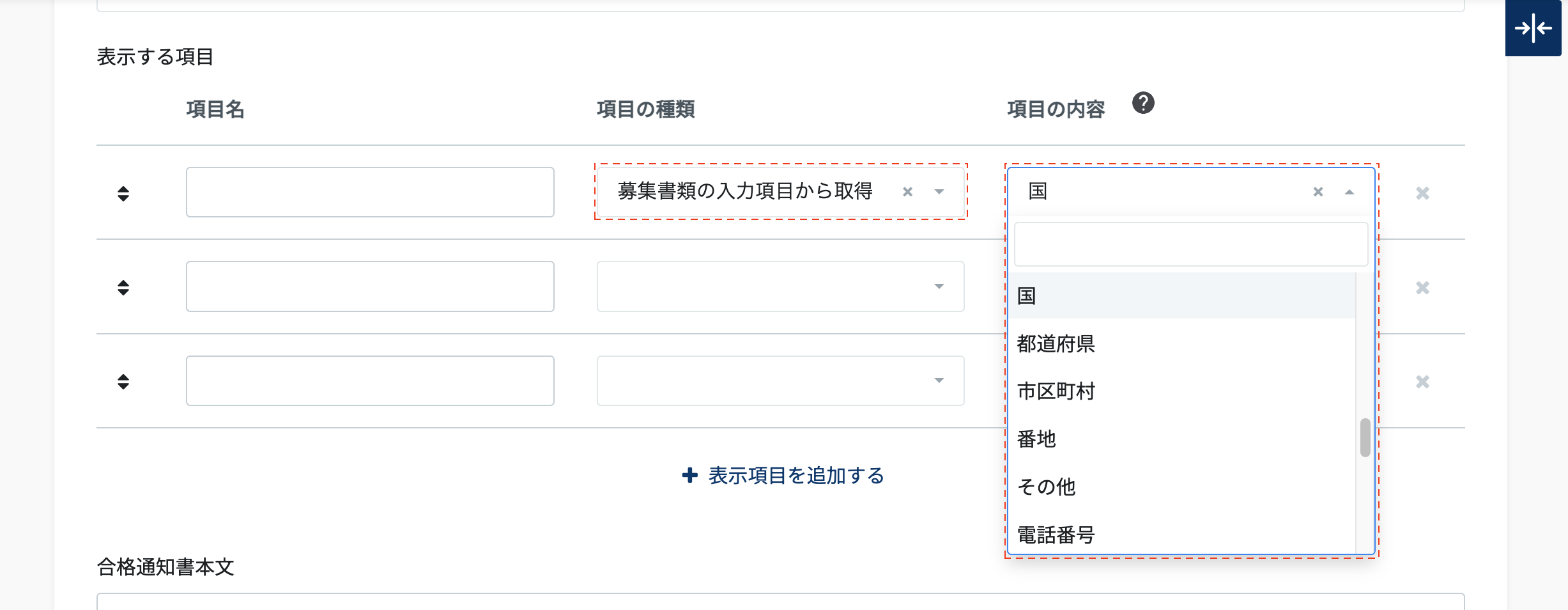 | 2次選考の合格通知作成時 ➡︎ 2次選考の募集書類の項目のみ選択可能 |