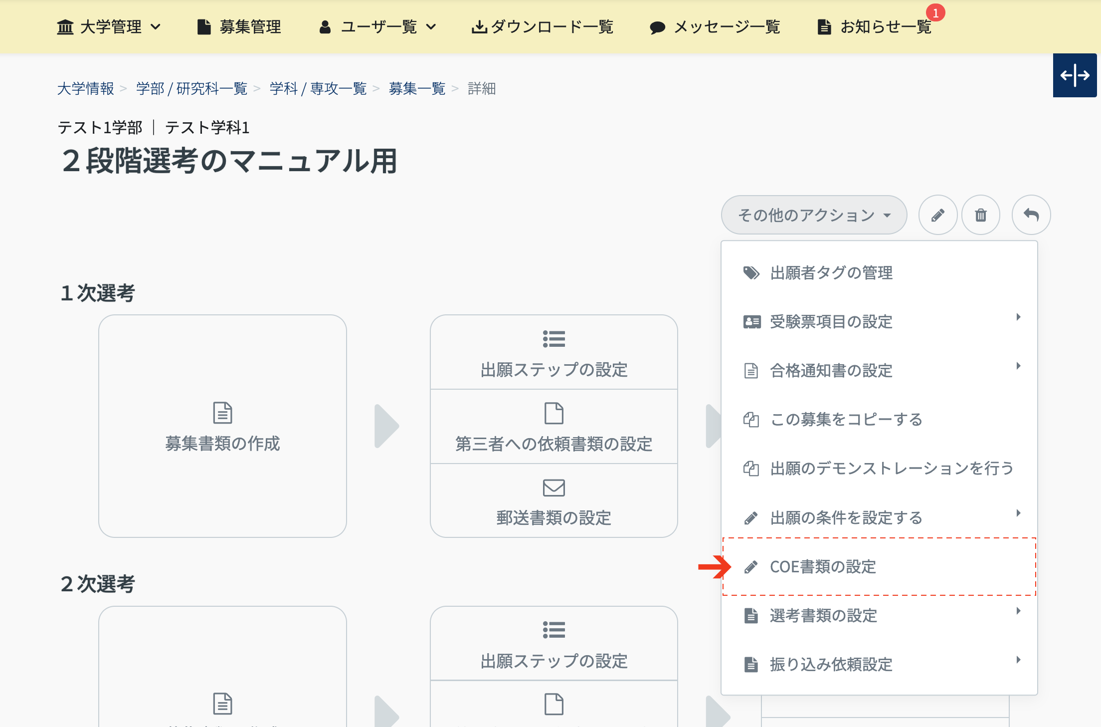 2段階選考を有効にしている場合、1次選考出願時、または2次選考出願時のいずれかのタイミングで提出書類として設定することができます。また「COE情報設定」「出願者COE情報一括設定」の方法については従来と変わりません。