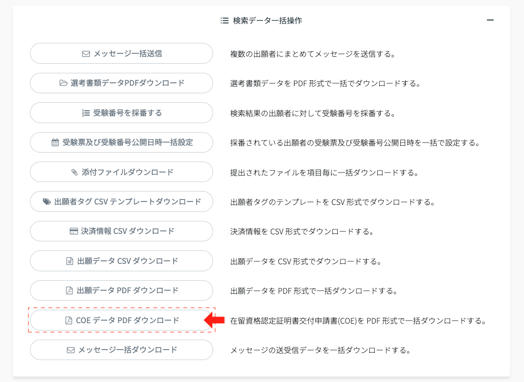 2. 「検索データ一括操作」 3. 「COEデータPDFダウンロード」 ![]() | 1. 1次選考の「出願者の管理」 2. 出願者の詳細 >「その他のアクション」 3. 「在留資格認定証明書交付申請書を出力する」 ![]() |