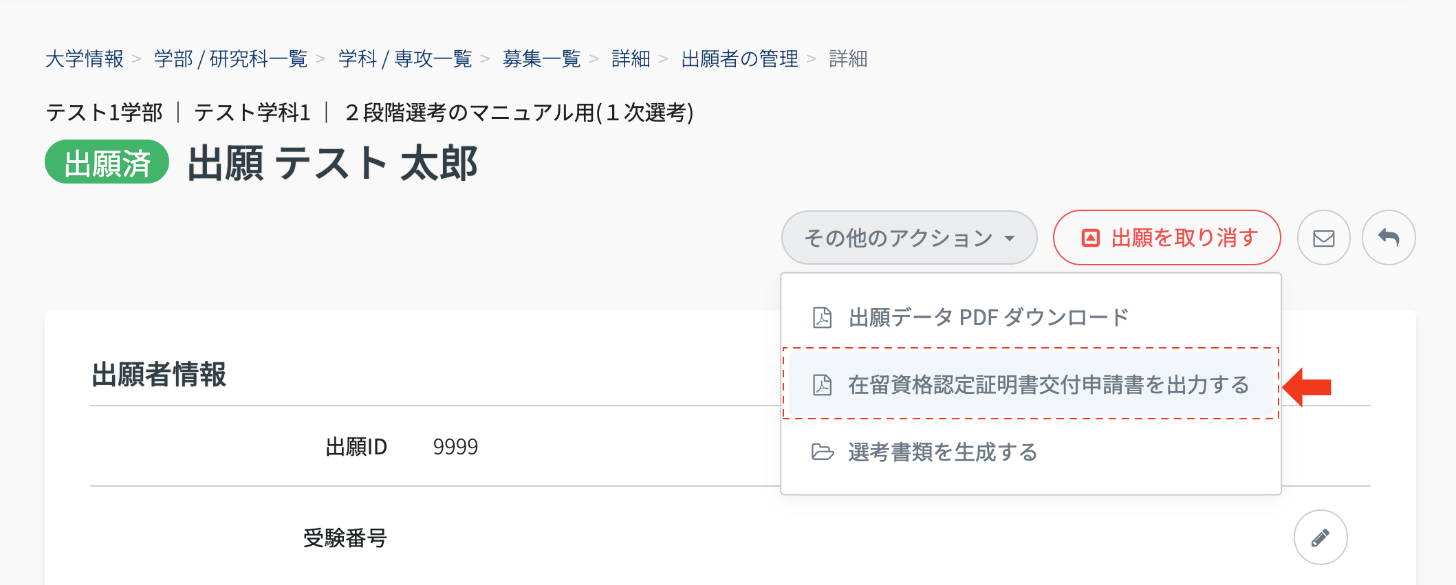 受験番号および受験票の公開日時の設定は、「出願者の管理」から次の2つの方法で操作することができます。